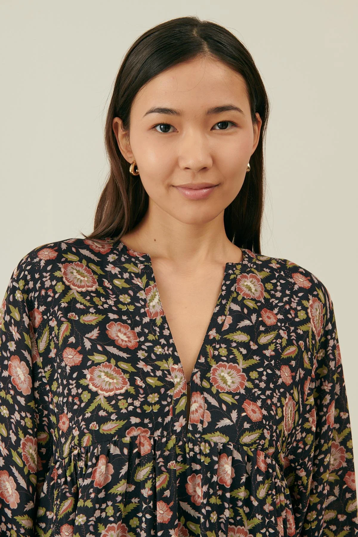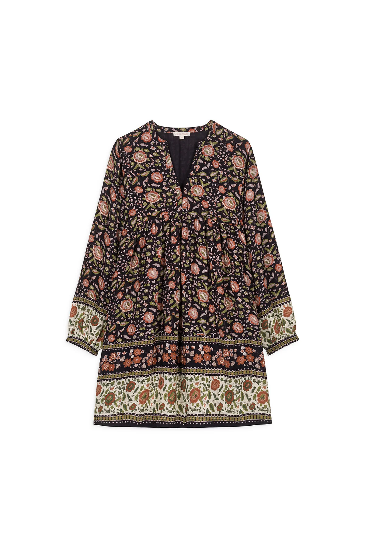 - Imprimé fleuri avec détail de frise contrastée en bas de vêtement et bas de manche.